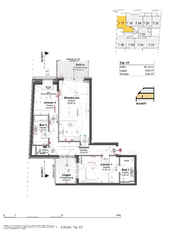 Die Top 17 ist eine 94 m², 3 Zimmerwohnung mit 2 Terrassen und befindet sich im 2.OG des Hauses. Der Grundriss ist sehr kompakt und alle Zimmer sind getrennt begehbar. Der Eingangsbereich ist gross und bietet ausreichend Garderobenplatz. Von hier, direkt begehbar sind die Schlafzimmer mit jeweils ein Bad-en-Suite eines davon mit eigener Terrassenausgang, eine Gästetoilette sowie das Wohnzimmer mit offener Küche und einen Ausgang auf einer 2te Terrasse.