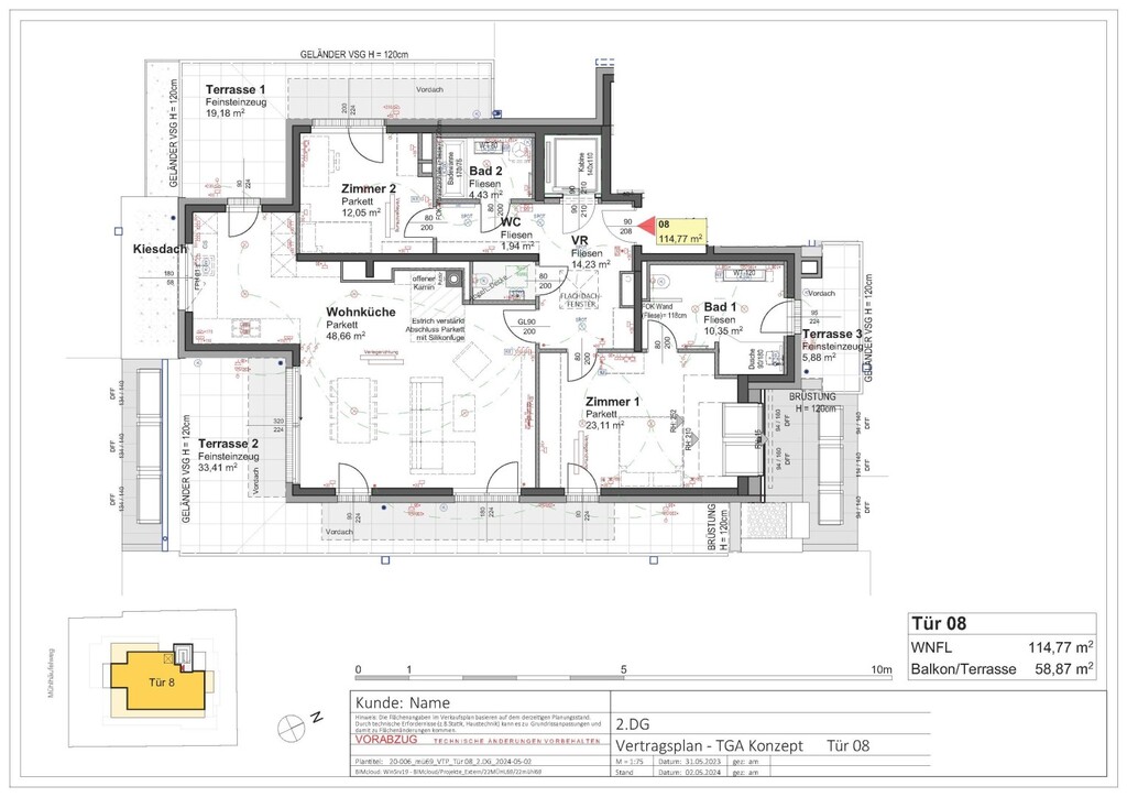 What remains are dignified 3 rooms, including two bedrooms, all separately accessible on a stately 115 m² living space with no less than additional almost 62 m² terrace for exclusive use and the access with the elevator directly into the penthouse.
