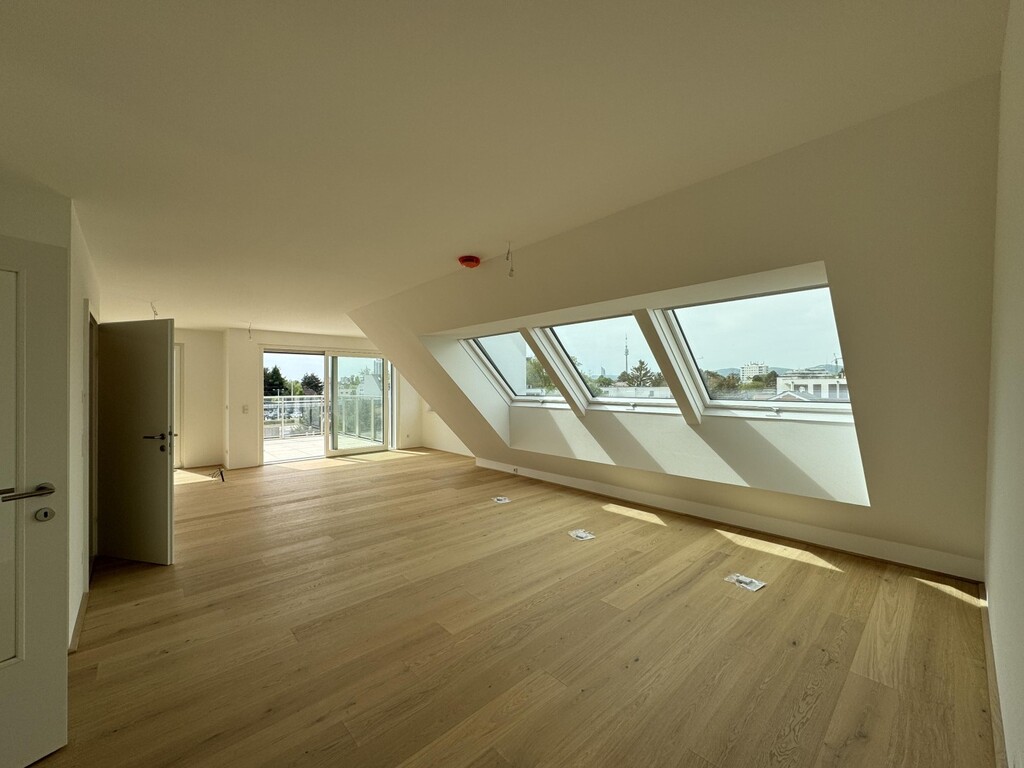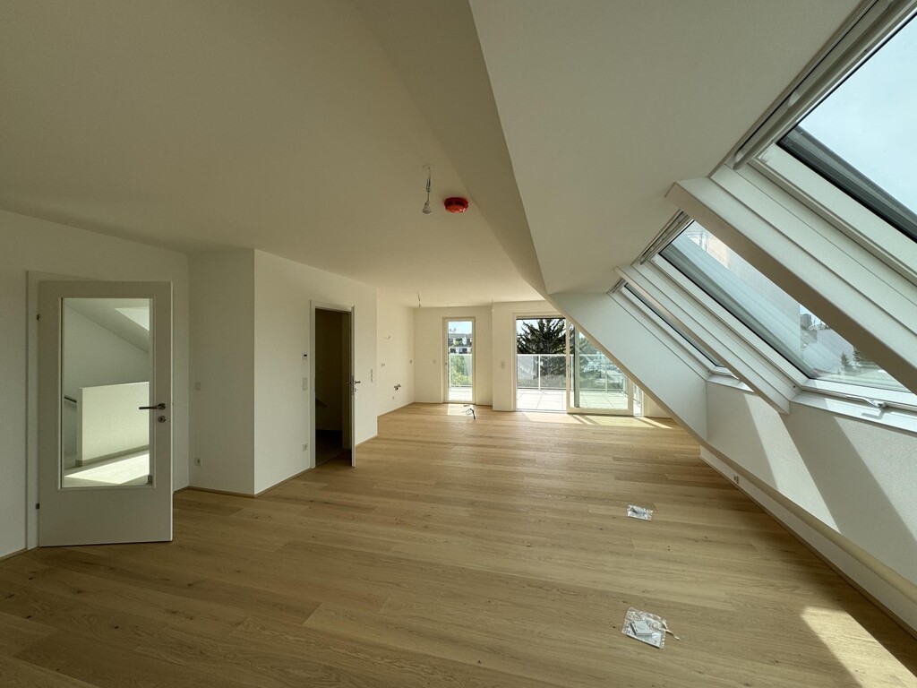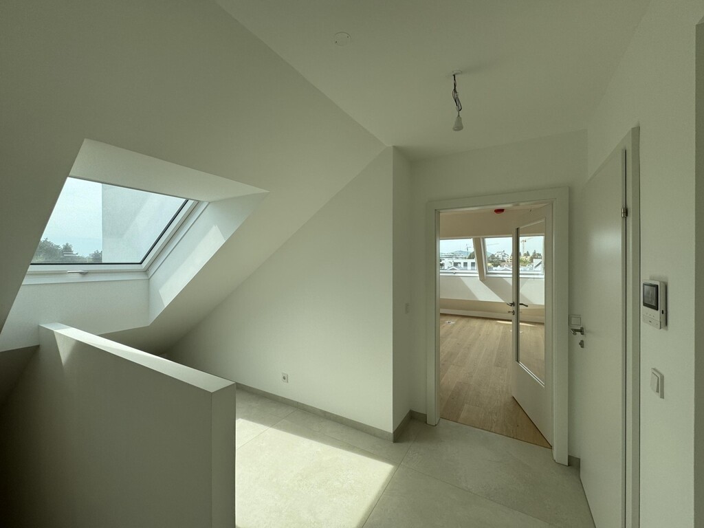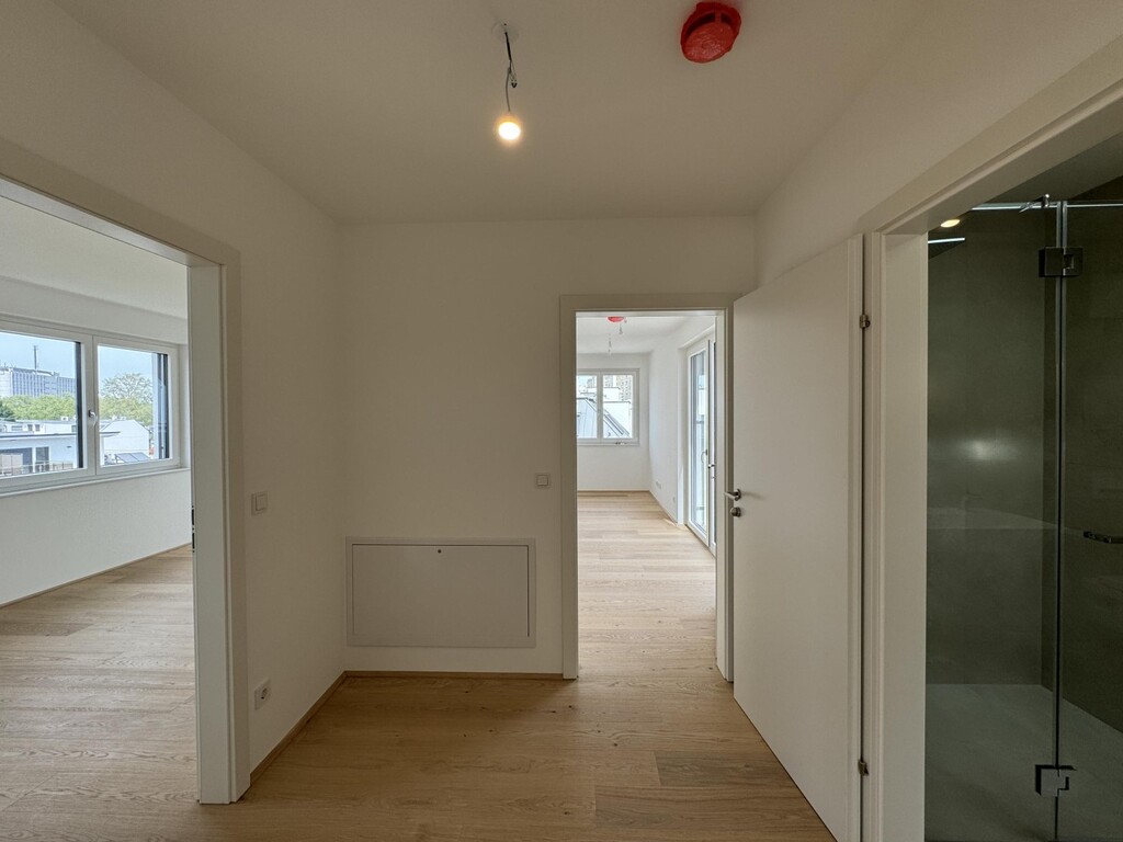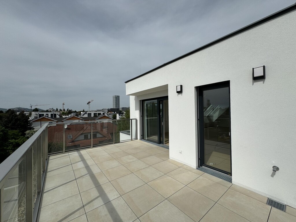 Die Top 107 ist eine 117 m², 3 Zimmerwohnung mit 30 m² Terrasse und befindet sich im 2. DG des Hauses. Man kann vom Stiegenhaus im 1. DG oder direkt mit dem Lift in 2. DG in der Wohnung gelangen. Hier befindet sich ausreichend Garderobenplatz und eine Toilette. Es folgt ein grosses Wohnzimmer mit offener Küche, ein Wirtschafts-/Abstellraum und Ausgang auf einer wunderschönen Terrasse. Weiter, über einen kleinen Flur sind 2 Schlafzimmer und ein Bad mit Badewanne, Dusche und Toilette erreichbar. Eines des Schlafzimmers bietet die Möglichkeit einer begehbaren Garderobe. Das andere Schlafzimmer hat Ausgang auf einer eigenen kleinen Terrasse. Sehr elegant und exklusiv!