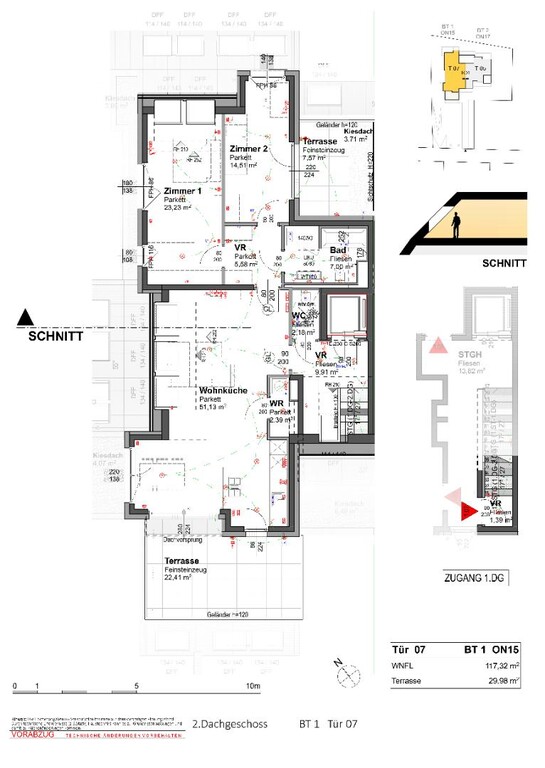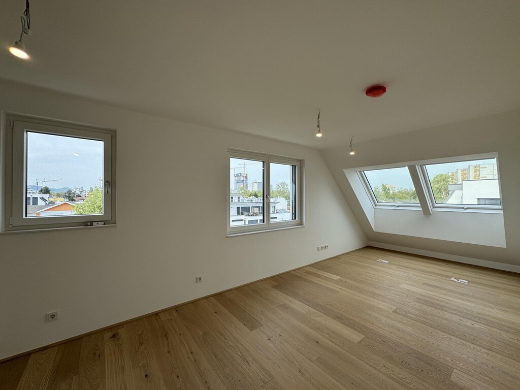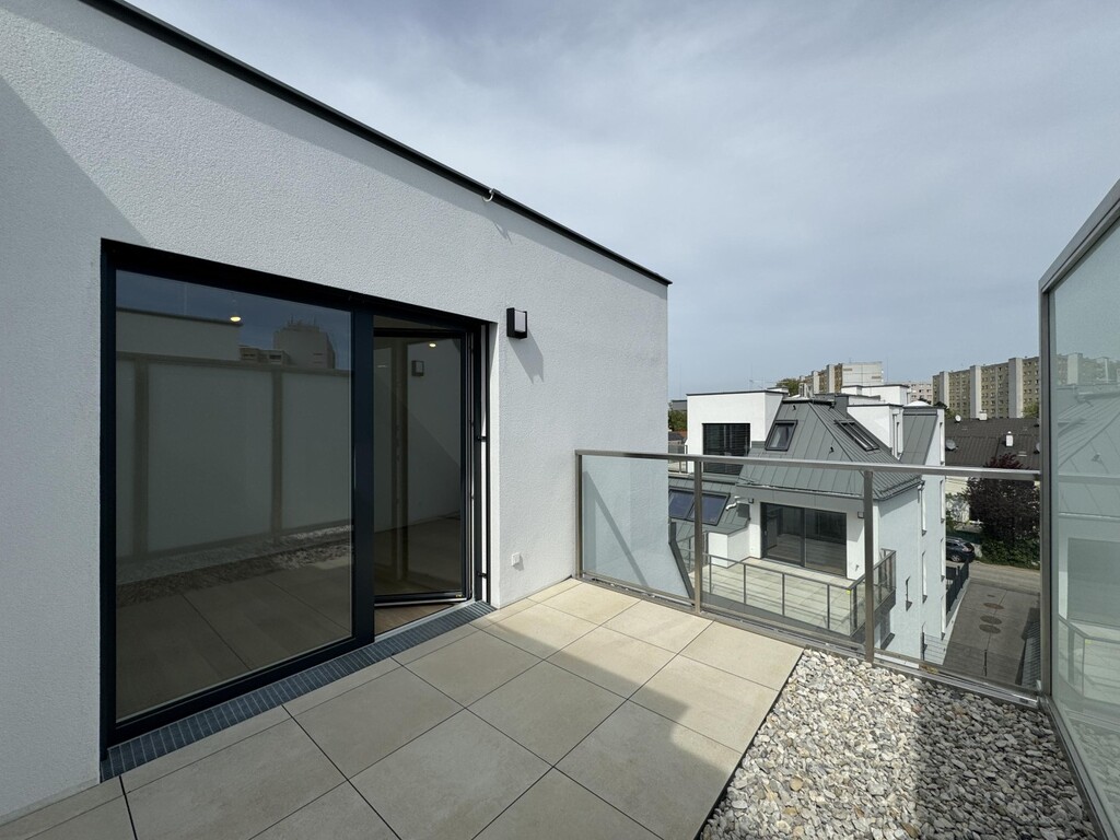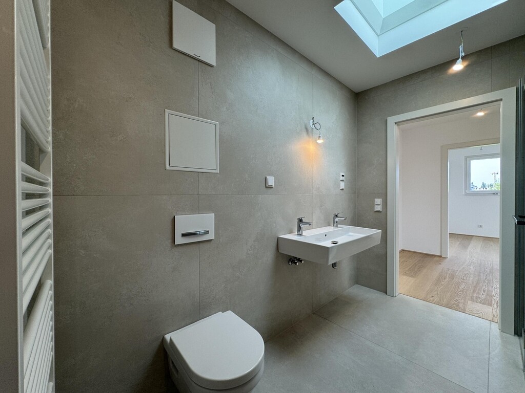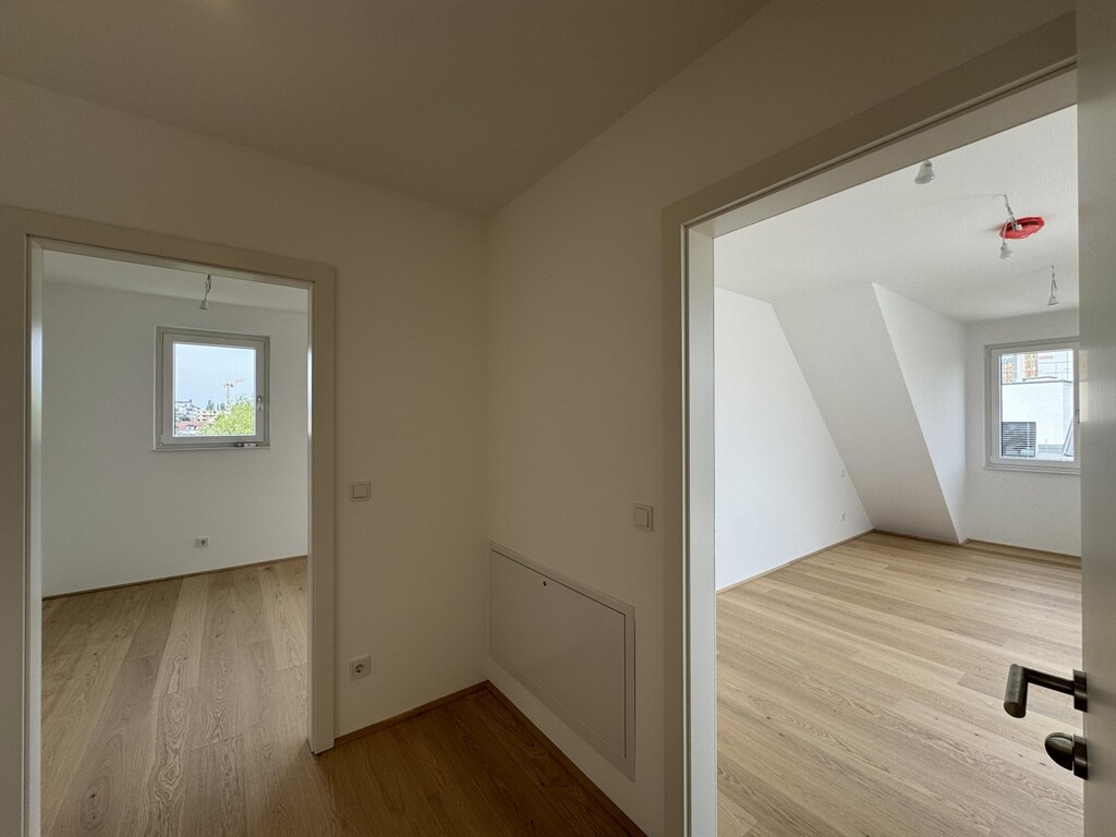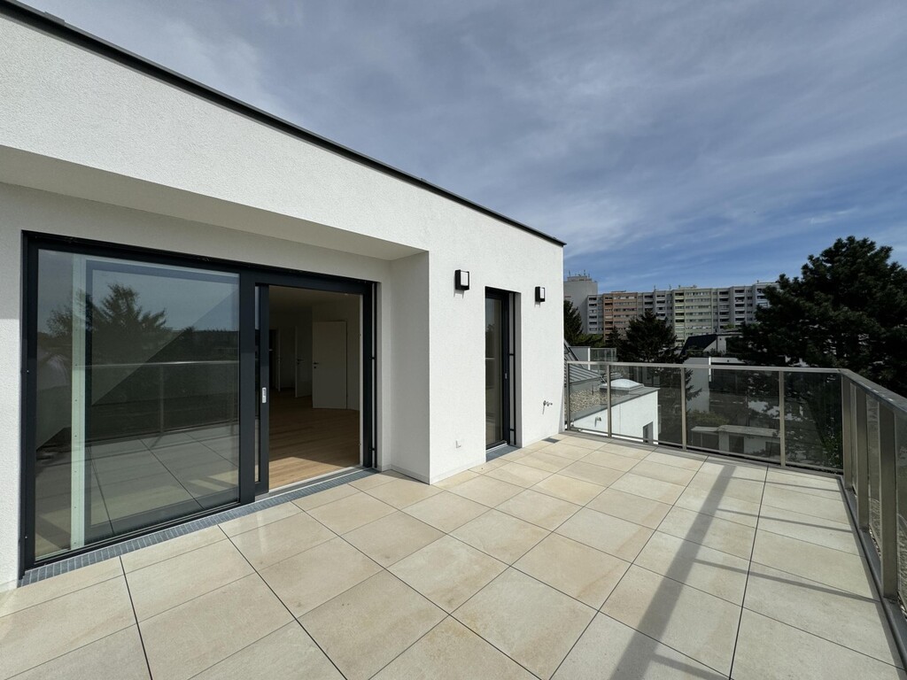 Die Top 107 ist eine 117 m², 3 Zimmerwohnung mit 30 m² Terrasse und befindet sich im 2. DG des Hauses. Man kann vom Stiegenhaus im 1. DG oder direkt mit dem Lift in 2. DG in der Wohnung gelangen. Hier befindet sich ausreichend Garderobenplatz und eine Toilette. Es folgt ein grosses Wohnzimmer mit offener Küche, ein Wirtschafts-/Abstellraum und Ausgang auf einer wunderschönen Terrasse. Weiter, über einen kleinen Flur sind 2 Schlafzimmer und ein Bad mit Badewanne, Dusche und Toilette erreichbar. Eines des Schlafzimmers bietet die Möglichkeit einer begehbaren Garderobe. Das andere Schlafzimmer hat Ausgang auf einer eigenen kleinen Terrasse. Sehr elegant und exklusiv!