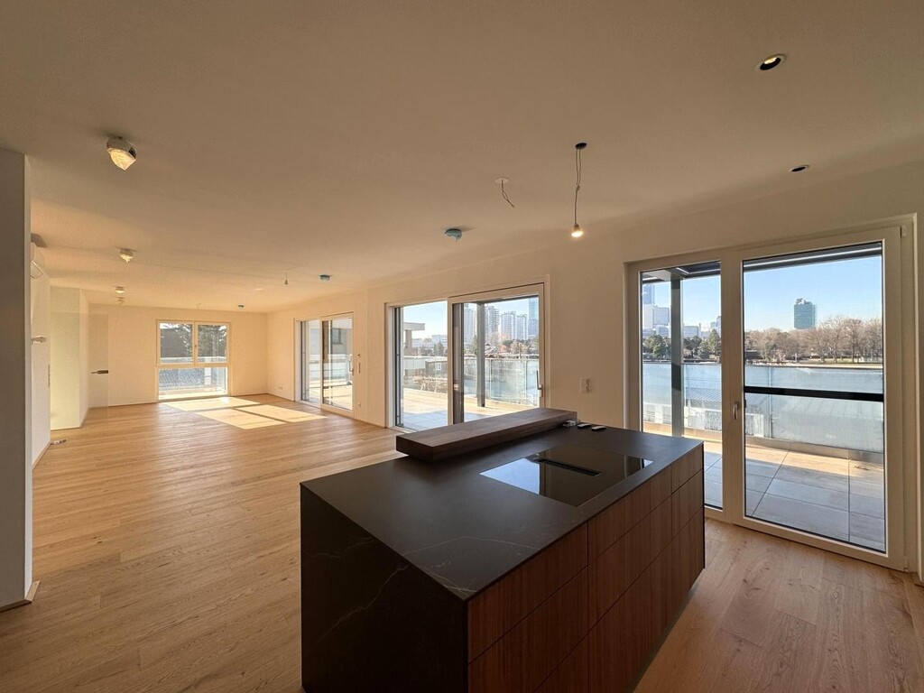 Der Wohnbereich ist mit insgesamt 64 m² angemessen gross und umrandet von knapp 75 m² Aussenfläche, von dem man die Alte Donau, die UNO-City und den Donauturm sieht.