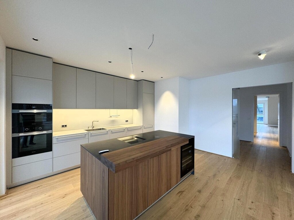 The entrance area already has a beatifully desgned wardrobe, modern lighting concept, mirror and is adjacent to the guest toilet. One of the 3 bedrooms is located on the north side and is surrounded by over 25 m² of outdoor space, 15 m² of which faces west. Between the entrance to the apartment and the bedroom is an air-conditioned hallway with a bespoke built-in wardrobe with sliding doors.