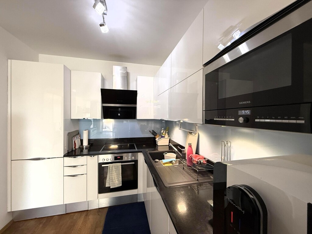 Die Küche bestehend aus Ober- und Unterkästen ist mit allen Geräten von Siemens (4-flammiges Herd, Backofen, Dunstabzug - Umluft, Geschirrspüler, Mikrowellengerät etc.) und mit Arbeitsplattenbeleuchtung ausgestattet.