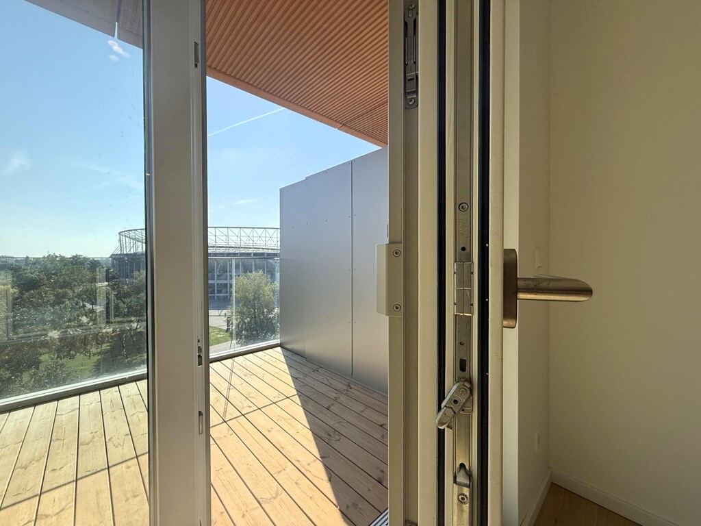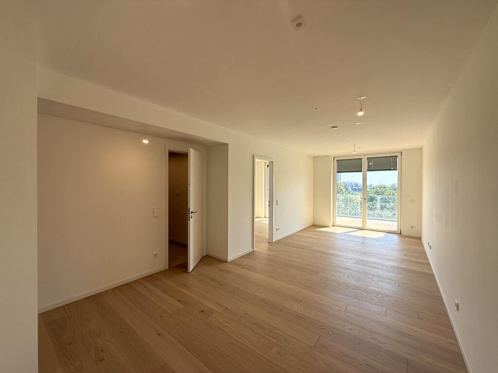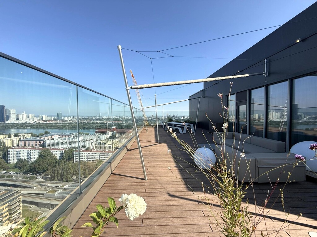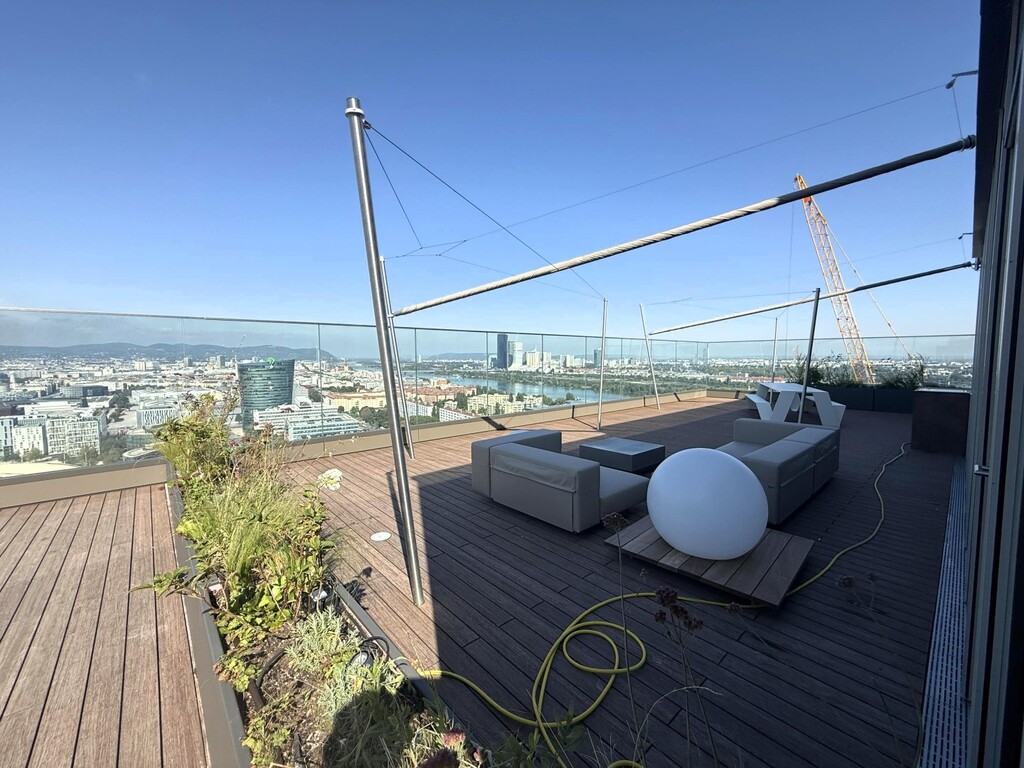In a brand-new 27-story high-rise, just completed and built to the low-energy standard of the incredible Energy Class A, an ultra-modern two-room apartment on the 6th floor is being offered for first-time occupancy on an initially limited 5-year rental contract. The apartment features breathtaking panoramic views and extensive amenities such as an elegant lobby, concierge service, socializing areas, rooftop outdoor pool with 360° views of Vienna, sauna, fitness facilities, and much more.