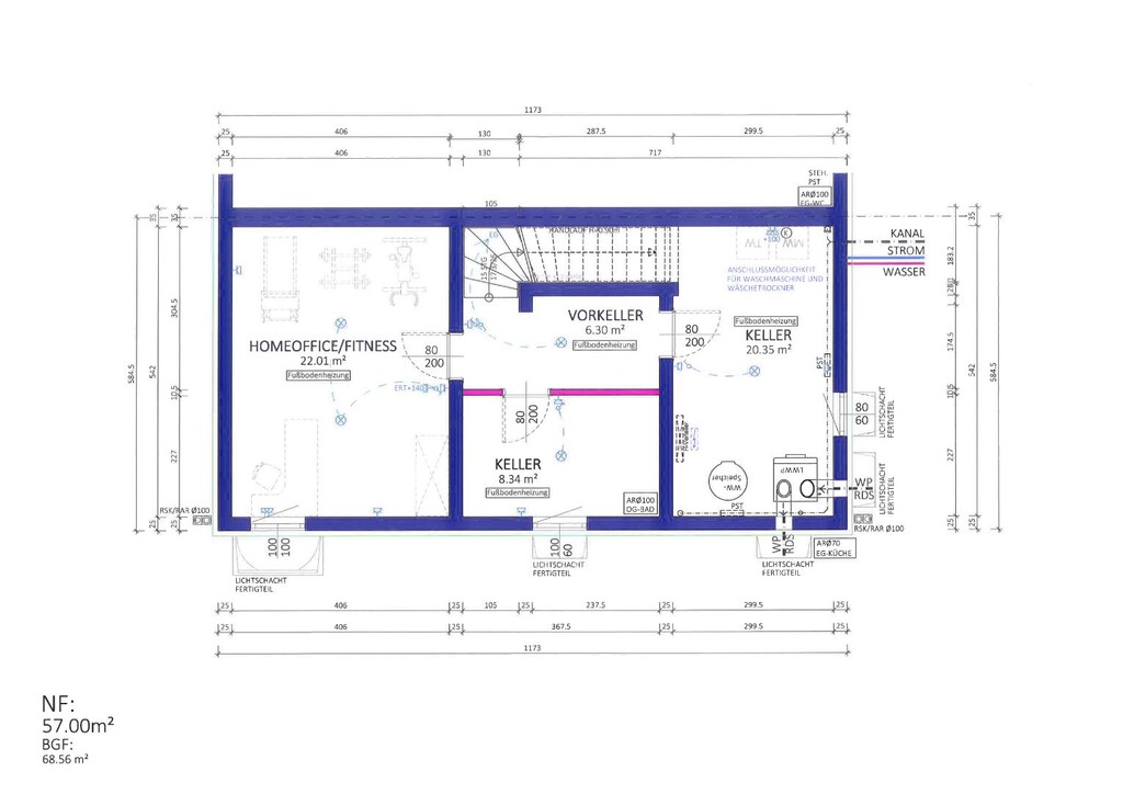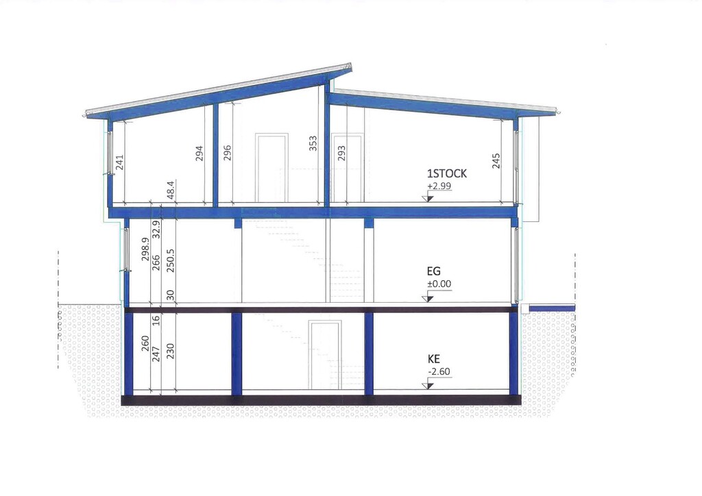 Das Haus steht auf Eigengrund ist sehr grosszügig geschnitten. Der Keller ist gross und auf jeden Fall wohnfähig gebaut. Im Erdgeschoss befindet sich ausreichend Garderobenplatz, eine Toilette sowie ein 52 m² Wohnesszimmer mit einer grosszügigen Küche und Ausgang auf eine Terrasse in dem Garten. Im Obergeschoss befinden sich drei grossen Schlafzimmern und ein geräumiges Bad mit Badewanne, Dusche und Toilette.