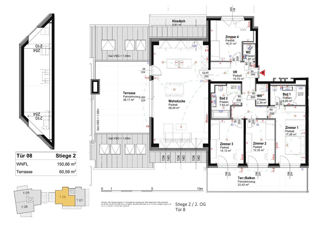 Die Top 208 ist eine 151 m², 5 Zimmerwohnung mit einer beeindruckenden offenen Terrasse und befindet sich im 2. OG des Hauses. Alle Zimmer sind getrennt begehbar. Der Eingangsbereich ist gross und bietet viel Platz für Garderobe. Links ist eine Toilette und ein Schlafzimmer, das schön abgelegen ist und sich als Homeoffice eignet. Geradeaus kommt man in einem sehr grossen Wohnzimmer mit offener Küche und Ausgang auf einer fast genauso grossen Terrasse, einfach beeindruckend. Rechts, über einen kleinen Flur sind weitere 3 Schlaf-zimmer begehbar, eines davon mit Platz für eine begehbarer Garderobe und ein Bad-en-Suite mit Dusche und Toilette. Auch hier sind ein Wirtschaftsraum und ein weiteres Bad mit Badewanne, Walk-in-Dusche und Toilette zu finden.