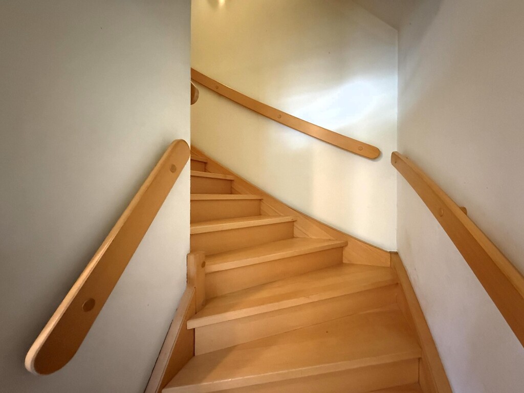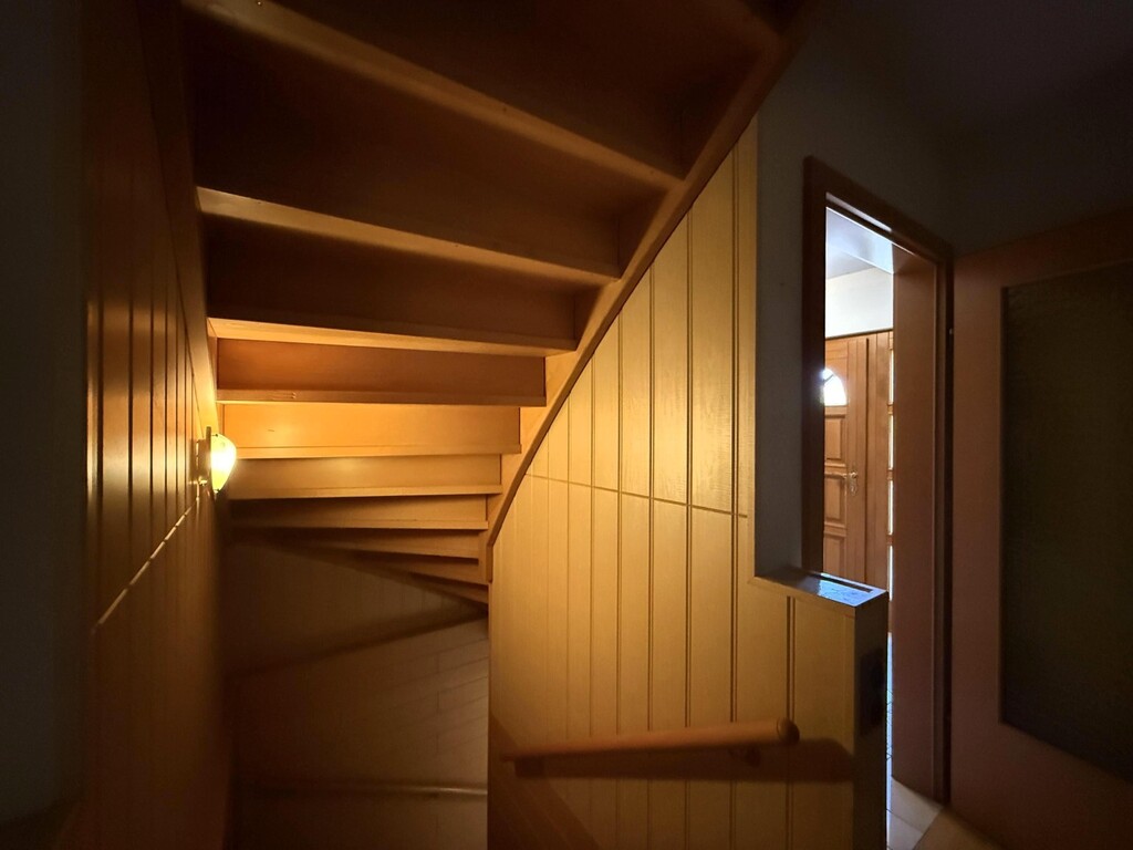 Über eine Holztreppe kommt man aus dem Vorraum ins