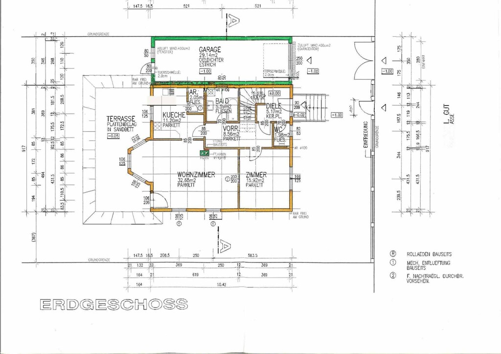 mit einem Rolltor, die vom Vorgarten in den Garten durchgeht, und die Platz für mindestens ein Auto, wenn nicht sogar zwei hat. Im Vorgarten kann ein weiteres Auto parken.