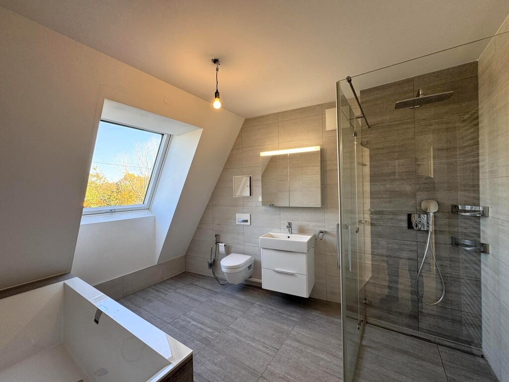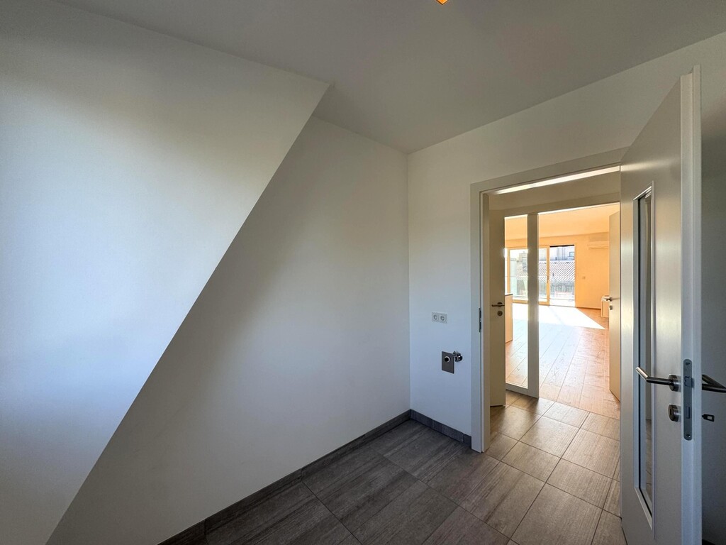 Located on the first attic floor, the apartment stands out for its bright, spacious layout and separately accessible rooms. The entrance hall provides ample space for a wardrobe. From here, both bedrooms, two bathrooms, and a utility room are accessible. The large living room with an open, modern kitchen and access to the loggia forms the heart of the apartment.