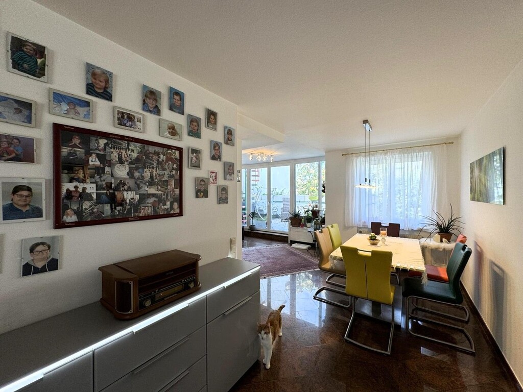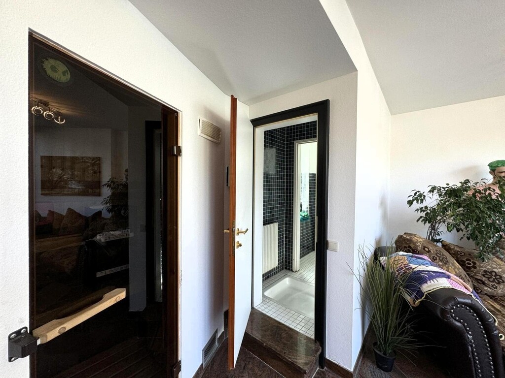 Im Essbereich ist (komplett eingebaut) noch eine finnische Sauna, ein angrenzendes Bad mit einem kleinen Handwaschbecken, Dusche und Toilette mit Fenster ins Freie in einem Lichthof, sowie ein Salon oder Ruhebereich mit Blick auf die angeschlossene, knapp 19 m² Terrasse. Vom Salon aus bietet die grosszügige und wandhohe Verglasung einen beruhigenden Ausblick auf die wunderschön begrünte Terrasse, die praktisch nicht einsehbar ist.