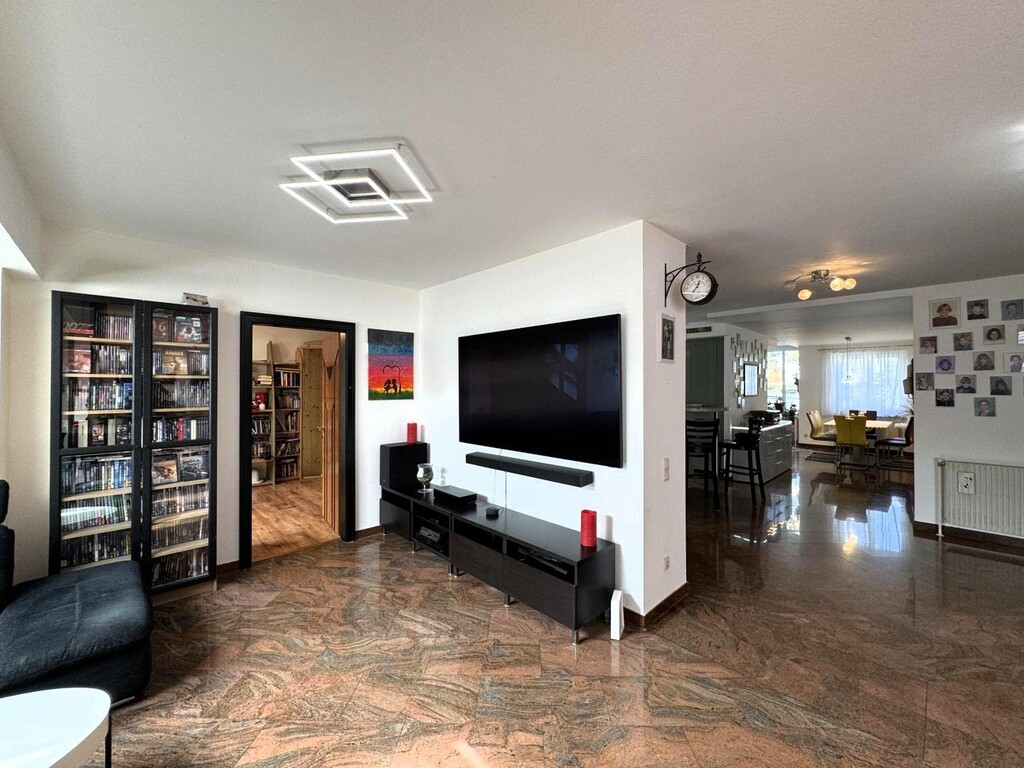 In the dining area there is a Finnish sauna (completely built-in) , an adjoining bathroom with a small hand basin, shower and toilet with a window to the outside in an atrium, as well as a lounge or relaxation area with a view of the adjoining, almost 19 m² terrace. From the lounge, the generous, wall-high glazing offers a calming view of the beautifully landscaped terrace, which is practically hidden from view.