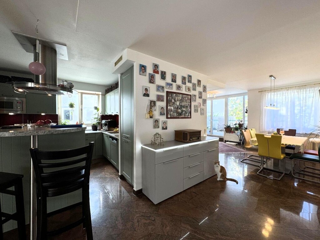 Die im Eingangsfoyer offen eingegliederte Küche hat 2 Speiseräume und beherbergt auch die Gasetagenheizung, mit der Wärme erzeugt und an die Heizkörper der Wohnung verteilt wird. Das grosse Bad wird zusätzlich durch einen eigenen Warmwasserspeicher versorgt, der elektrisch beheizt wird.