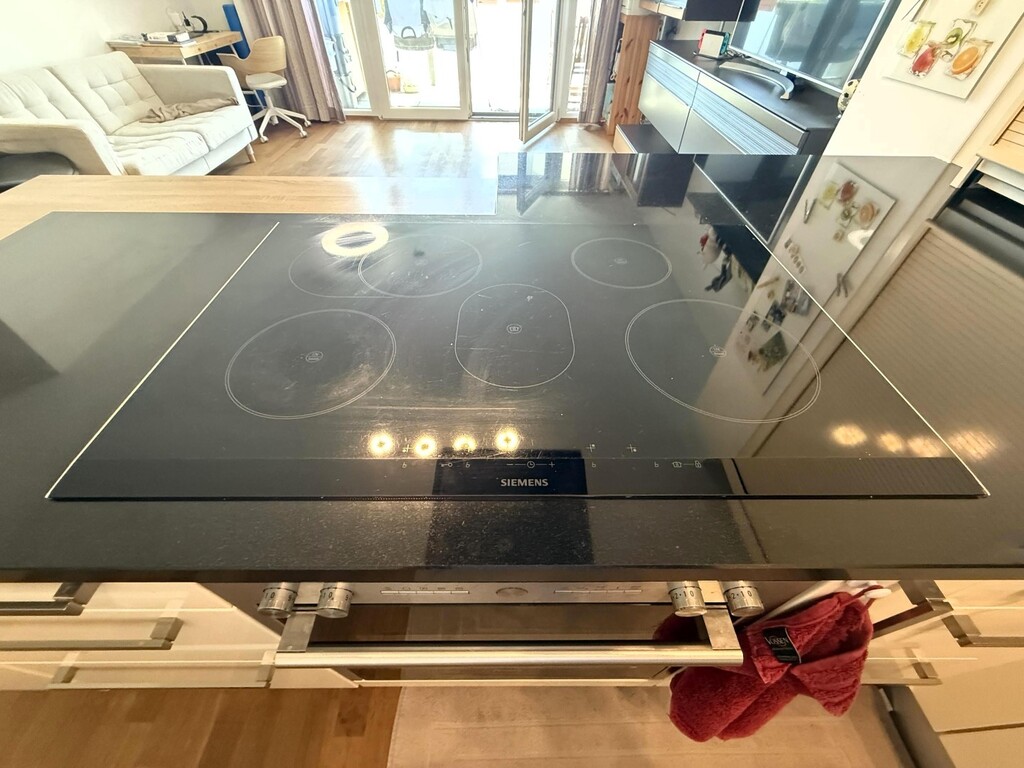 Ein besonderes Highlight ist die moderne, offen gestaltete Küche mit Kochinsel, schwarzer Steinplatte und hochwertigen Markengeräten von Siemens, mit Ausnahme des – sind im Kaufpreis inkludiert.