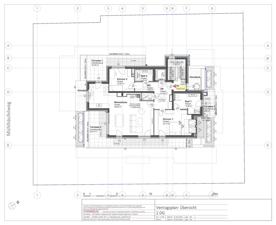 What remains are dignified 3 rooms, including two bedrooms, all separately accessible on a stately 115 m² living space with no less than additional almost 62 m² terrace for exclusive use and the access with the elevator directly into the penthouse.