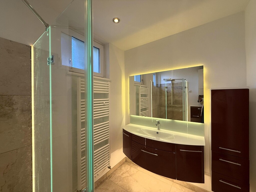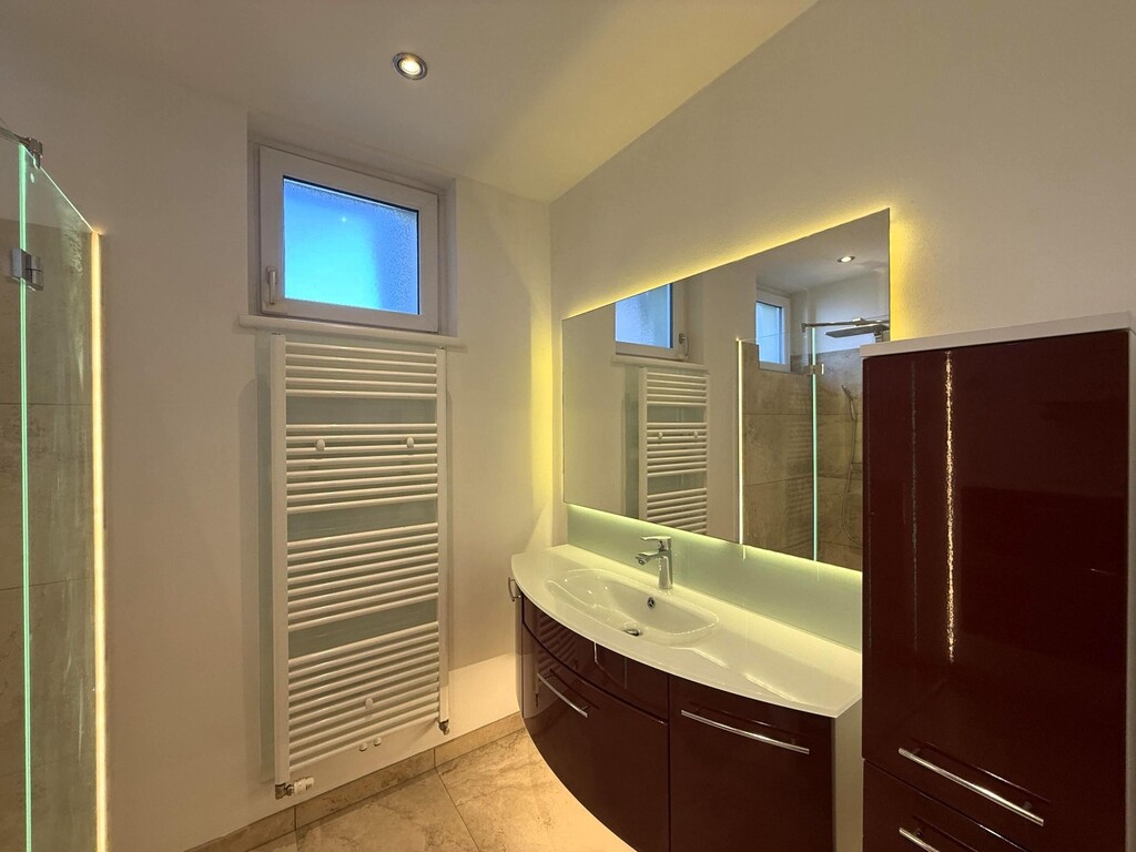 Das moderne Badezimmer mit Fenster überzeugt mit eleganter Glasdusche, stilvollen Möbeln in Dunkelkirsche, grossem beleuchtetem Spiegel, Handtuchheizkörper, Waschmaschinenanschluss sowie elektrischer Fussbodenheizung.