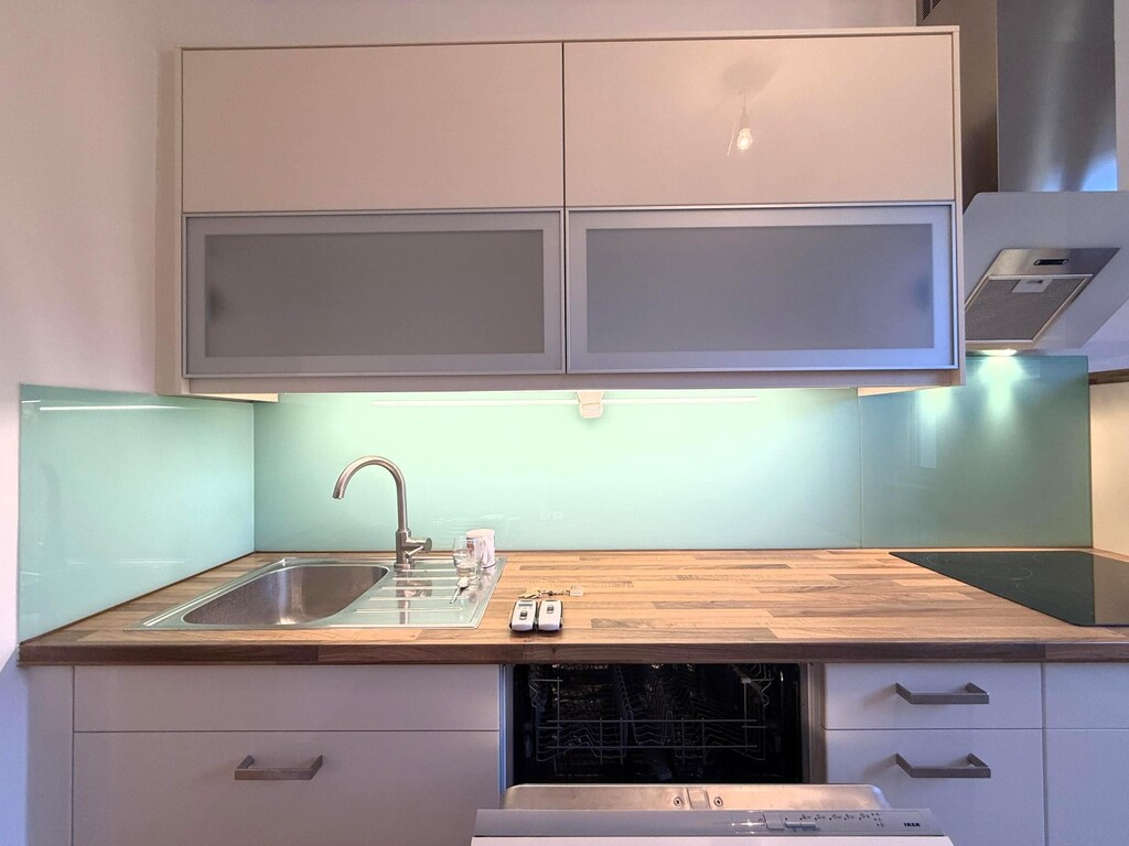 Die Küche ist ein Traum für Hobbyköche: eine elegante Einbauküche mit Fenster, kleiner Bar, qualitativen Geräten (Backofen, eHerd, Geschirrspüler, Dunstabzug, Spüle) sowie stimmungsvoll beleuchteter Arbeitsplatte.