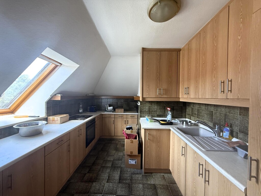 Auch das Dachgeschoss bildet eine eigenständige, weitere (zweite) Wohneinheit, eigentlich hat dieses Einliegerwohnungsqualität: eigene Küche, Schlafzimmer, ein aus dem Baujahr des Hauses noch stammendes Bad jedoch ebenfalls mit Toilette im eigenen Raum hat, eignet sich auch das Dachgeschoss perfekt als eigenständige Wohneinheit, am besten als Einliegerwohnung.